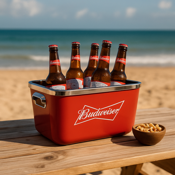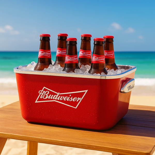 Quer servir suas bebidas com muito mais estilo? Chegou o balde de gelo para bebidas da Budweiser. Produto licenciado e feito de plástico resistente, sendo leve e prático para carrega-lo.