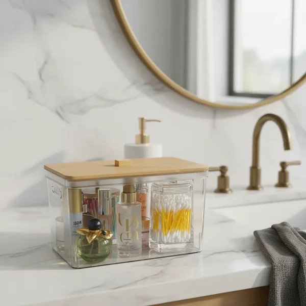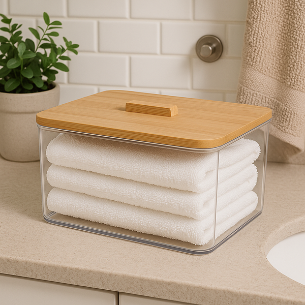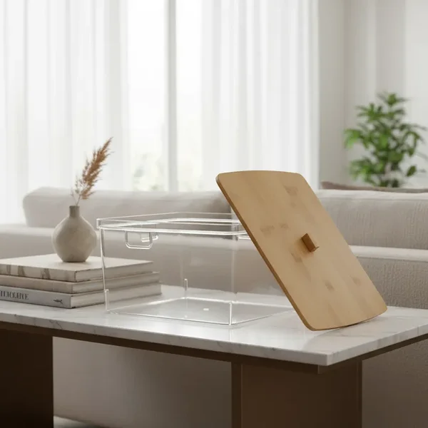 - 1 Caixa Organizadora Transparente Com Tampa De Bambu 27x27x17cm