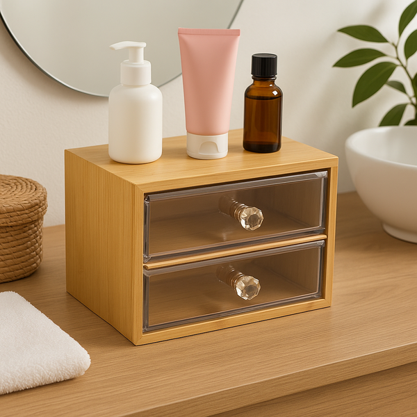 - 1 Caixa Organizadora de Bambu com 2 Gavetas de Acrílico