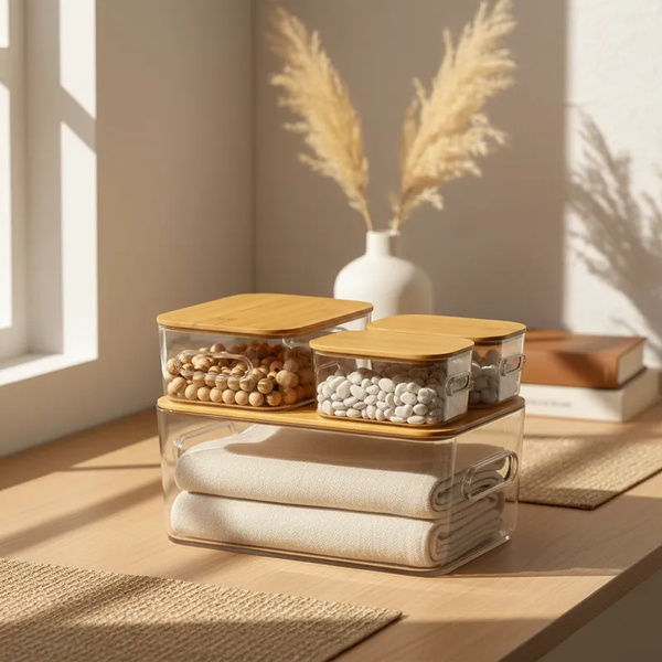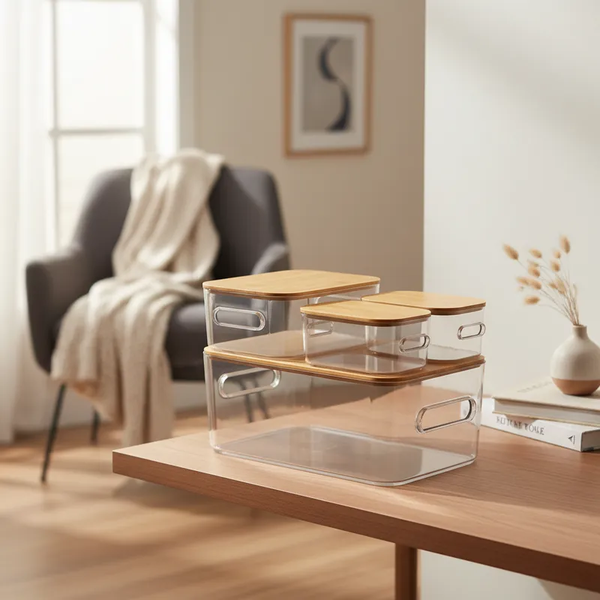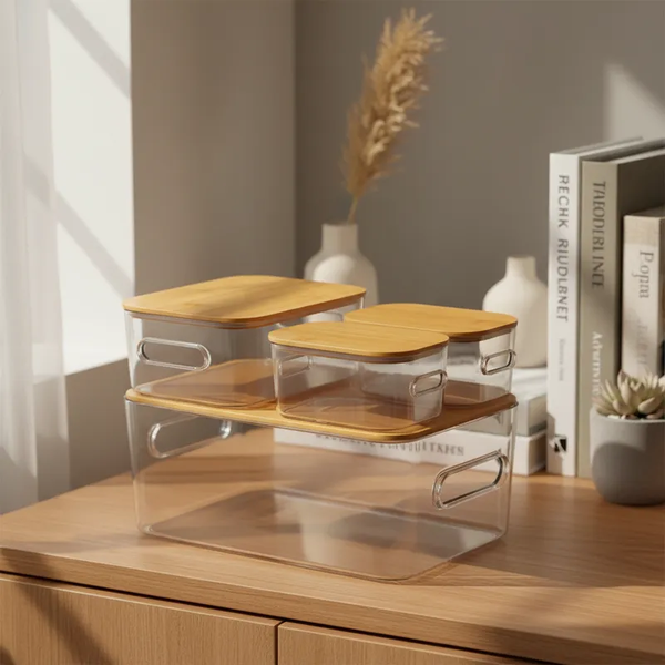 Material de Alta Qualidade: Feitas em acrílico transparente, permitindo fácil visualização do conteúdo, enquanto a tampa de bambu confere um toque natural e sofisticado.
