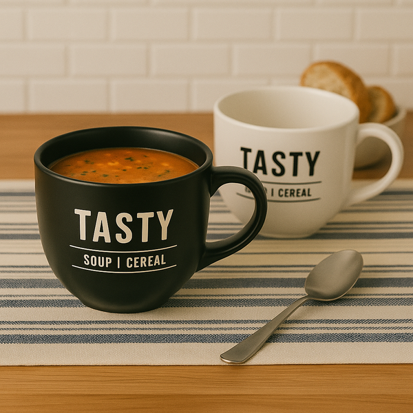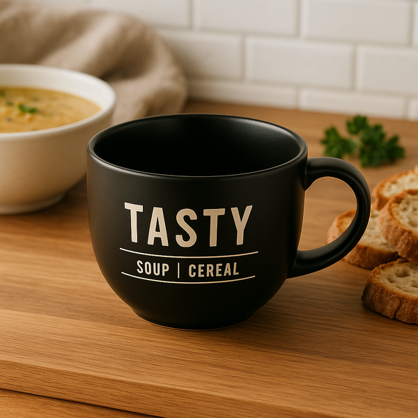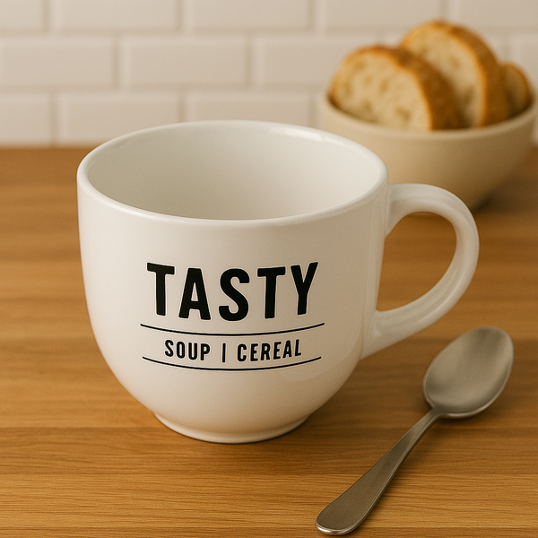 Para quem ama refeições práticas, confortáveis e com estilo, a Caneca Sopeira Jumbo TASTY é a escolha ideal. Com capacidade generosa de 750ml, ela é perfeita para servir sopas, caldos, cereais, frutas e muito mais. Fabricada em cerâmica de alta qualidade, oferece excelente isolamento térmico e resistência para o uso diário. Disponível nas cores preta ou branca com estampa moderna "TASTY | Soup | Cereal", ela combina funcionalidade com um visual contemporâneo que também decora a cozinha.