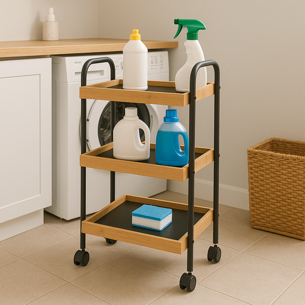 O Carrinho possui Rodinhas para facilitar ainda mais o transporte, podendo ser levado para qualquer ambiente sem esforço e sem riscar o piso. Possui 3 prateleiras de Bambu para melhor organização e separação dos objetos. Além de todos esses benefícios, o carrinho é de fácil higienização, somente com um pano úmido regularmente você deixa o seu carrinho higienizado.