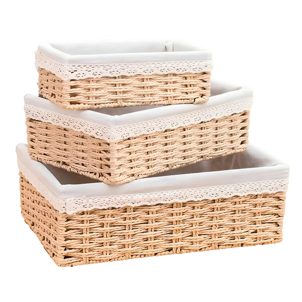 Feitas com material de alta qualidade, incluindo metal na sua estrutura, fibra natural trançada e um forro 100% algodão com detalhes em renda, eles são tão elegantes quanto versáteis. A estrutura de metal oferece durabilidade e resistência, enquanto a fibra natural proporciona um visual leve e arejado. O forro do cesto proporciona uma superfície macia e charmosa para suas apresentações e podem ser retirados para higienização.