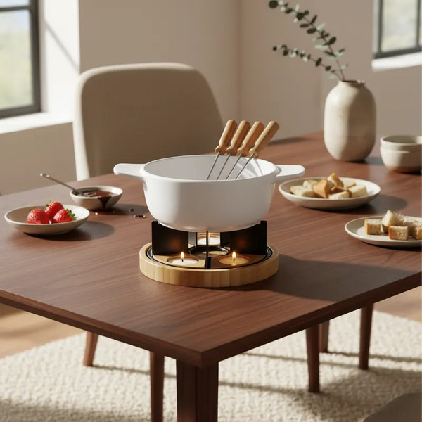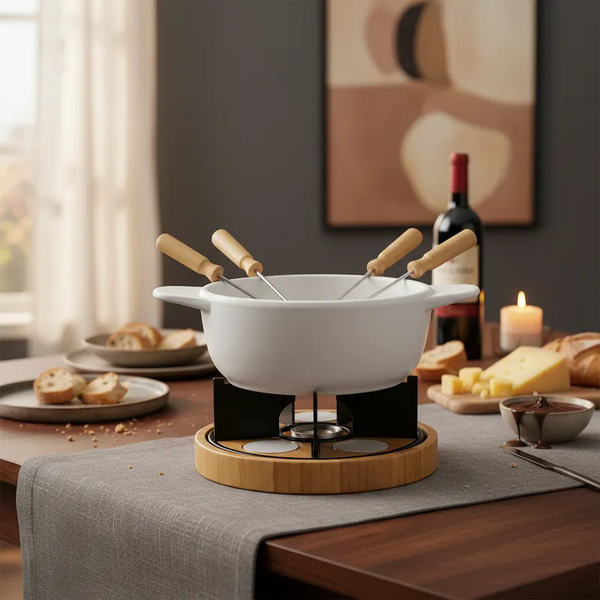 Conjunto Abrangente: Inclui 1 panela de cerâmica de 700ml, 1 suporte, 1 base de bambu, 4 garfos de fondue e 5 velas. Design Elegante: Com um acabamento moderno e sofisticado, o conjunto se destaca em qualquer mesa, tornando-se uma peça decorativa que complementa seu estilo de jantar.