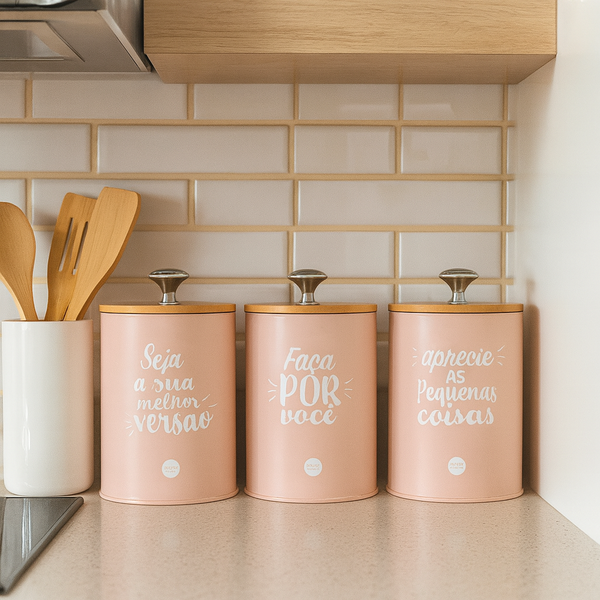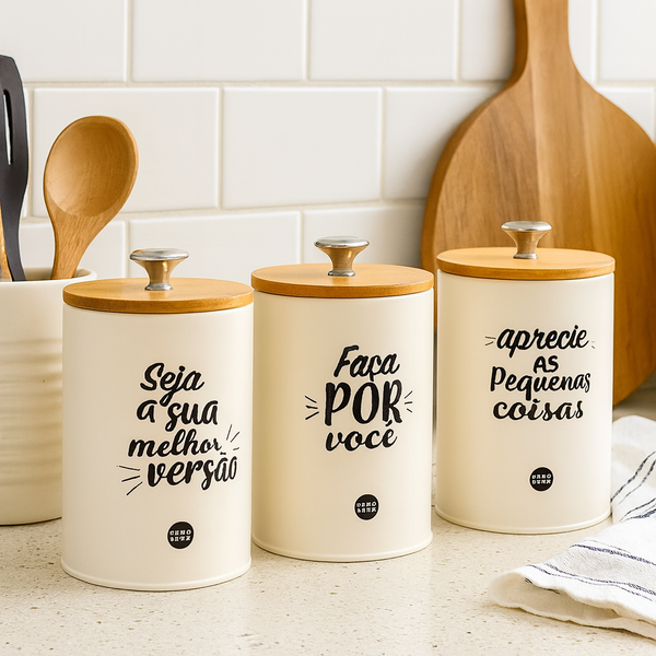 Transforme a organização da sua cozinha em um detalhe cheio de charme. O Kit com 3 Latas Herméticas traz frases inspiradoras que deixam o ambiente mais leve e acolhedor, enquanto mantêm seus alimentos frescos por muito mais tempo. As tampas de bambu adicionam um toque natural e sofisticado, combinando praticidade com design moderno.