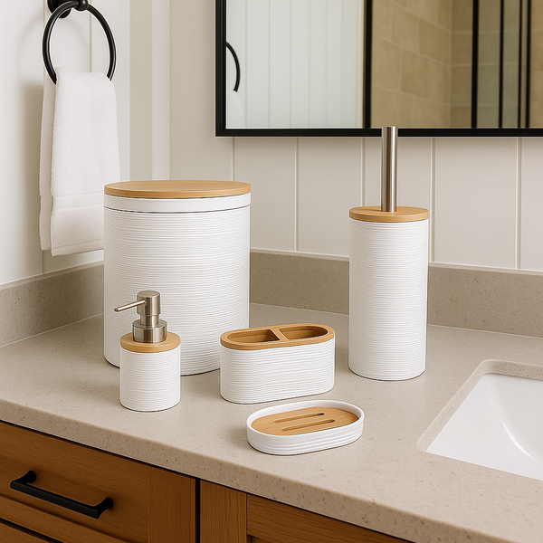 Renove seu banheiro com elegância, funcionalidade e um toque natural com este Kit de Banheiro 5 Peças com Detalhes em Bambu. Com design moderno, acabamento branco texturizado e tampa em bambu natural, o conjunto é ideal para quem busca praticidade sem abrir mão da estética.